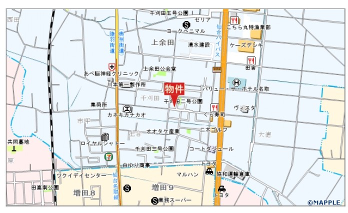 ヨークタウン名取バイパスまで670m , セブンイレブン名取上余⽥店まで460m , 名取市⽴増⽥中学校まで2050m , 名取市⽴増⽥⼩学校まで1610m , スクルドエンジェル保育園増⽥園まで250m , 名取増⽥郵便局まで1060m , 名取市役所まで1680m