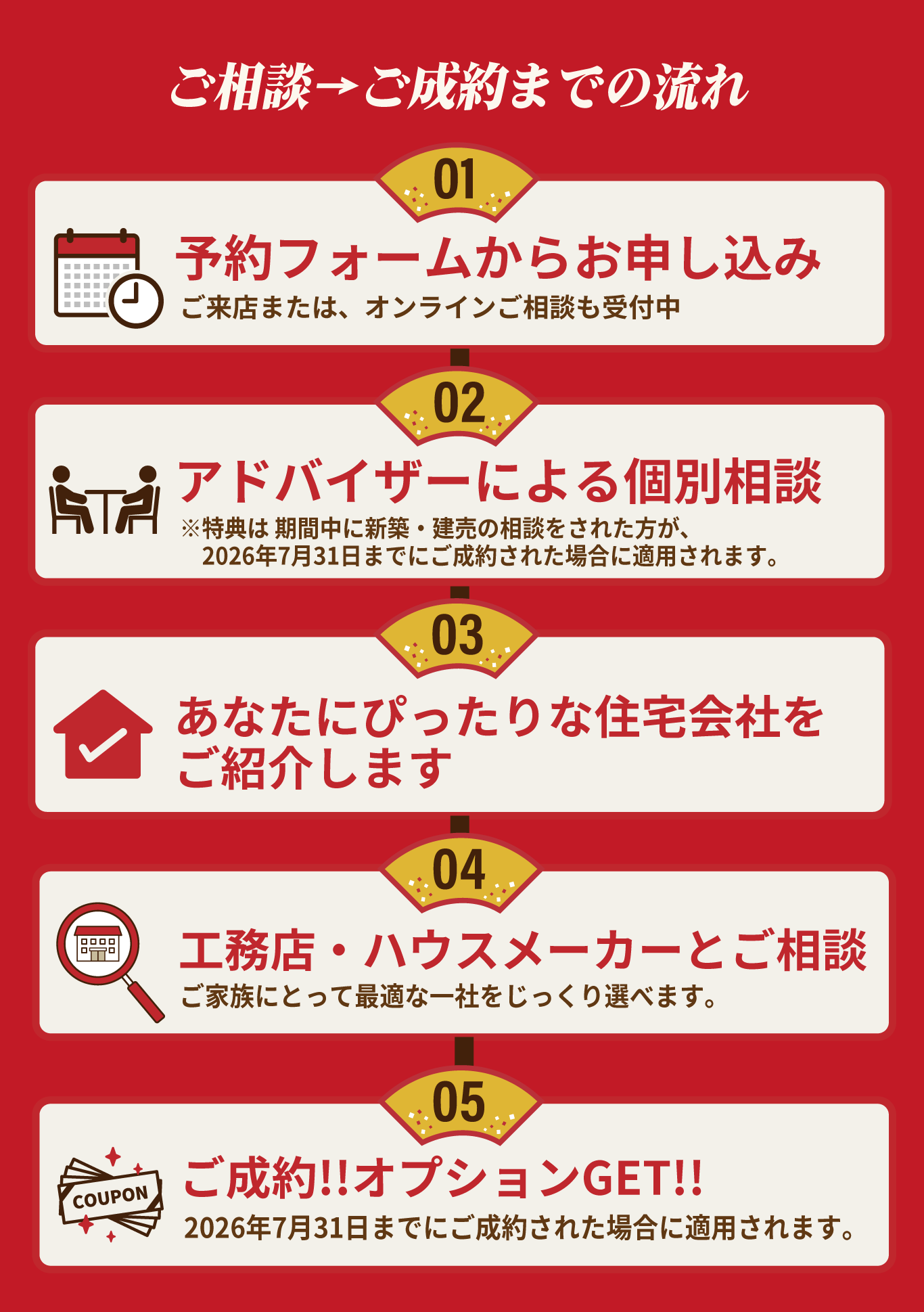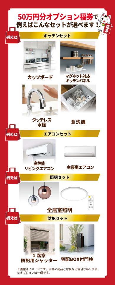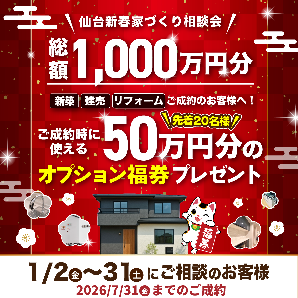 【ご成約特典】 期間中に新築・建売・リフォームのいずれかを相談された方が2026年7月31日までにご成約された場合 先着20名様限定で、 ※建売、リフォームの場合では内容が異なります |