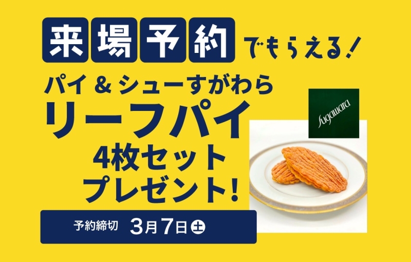 | 参加費 | 参加費無料! 事前来場予約で、『パイ&シュー すがわら「リーフパイ」4枚セット』をプレゼント! |